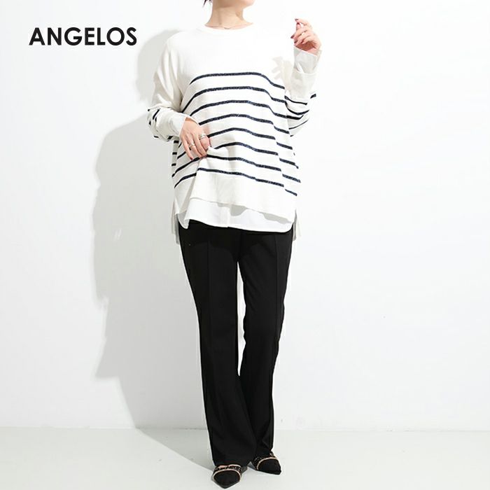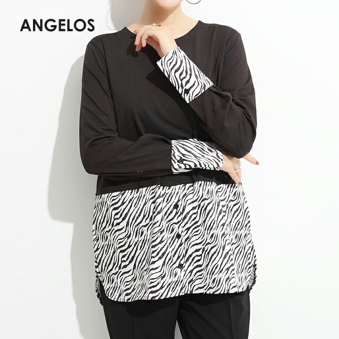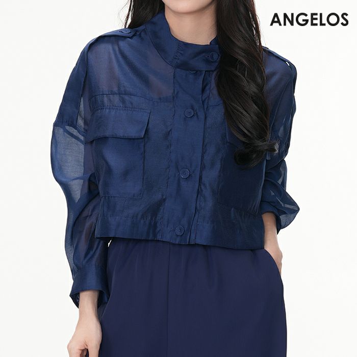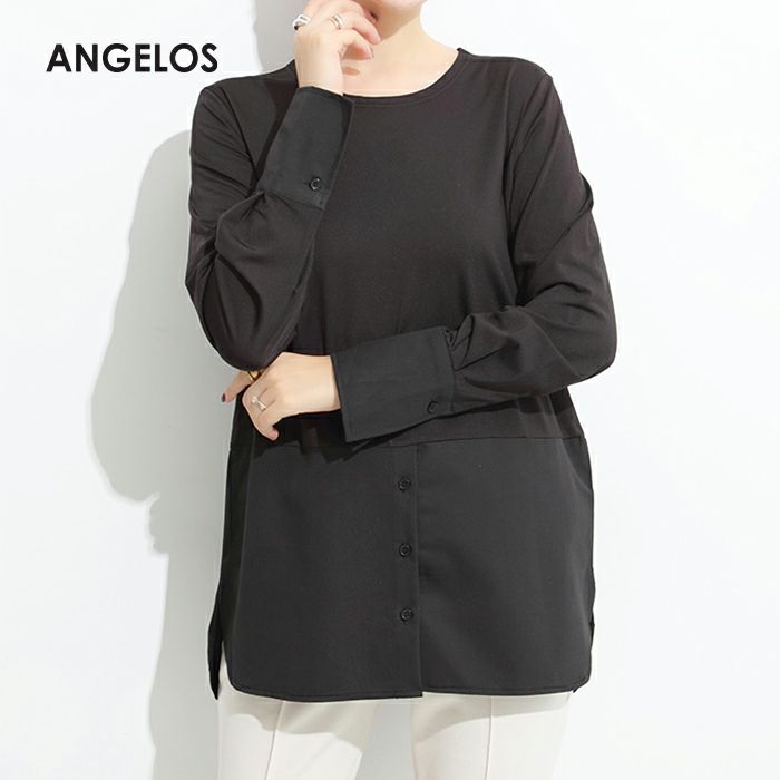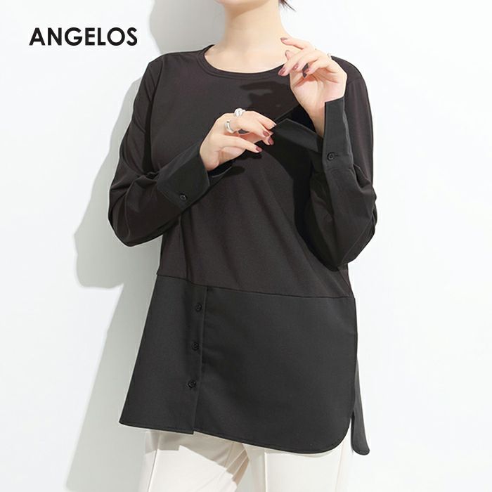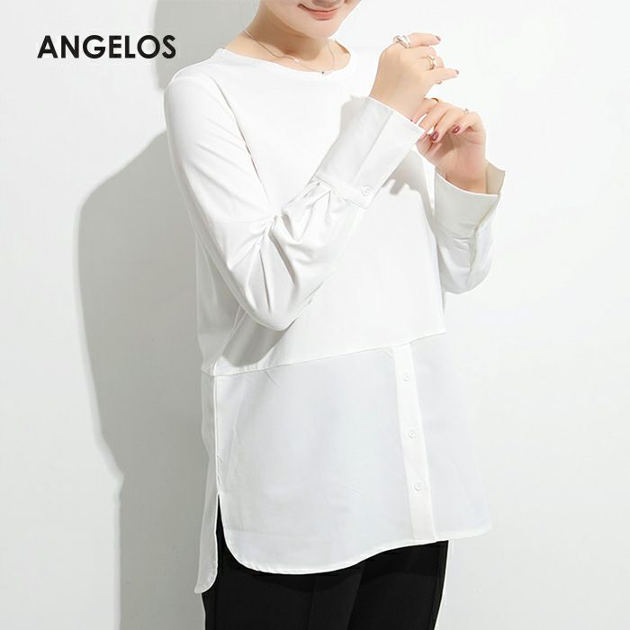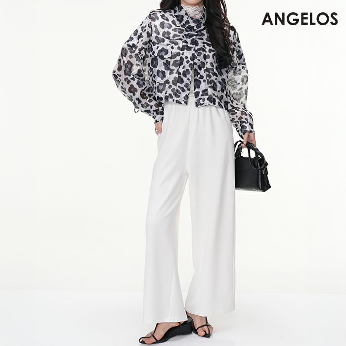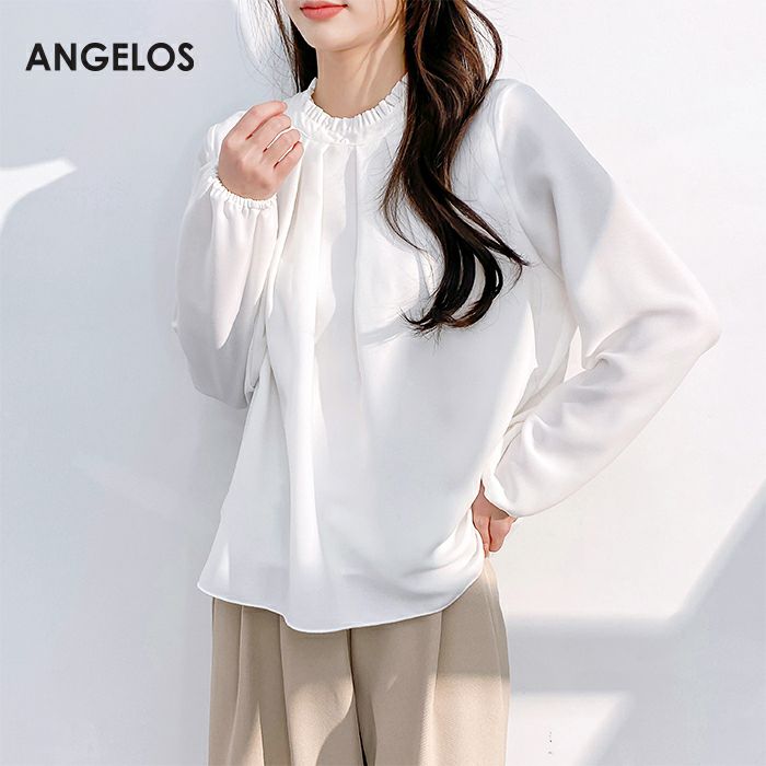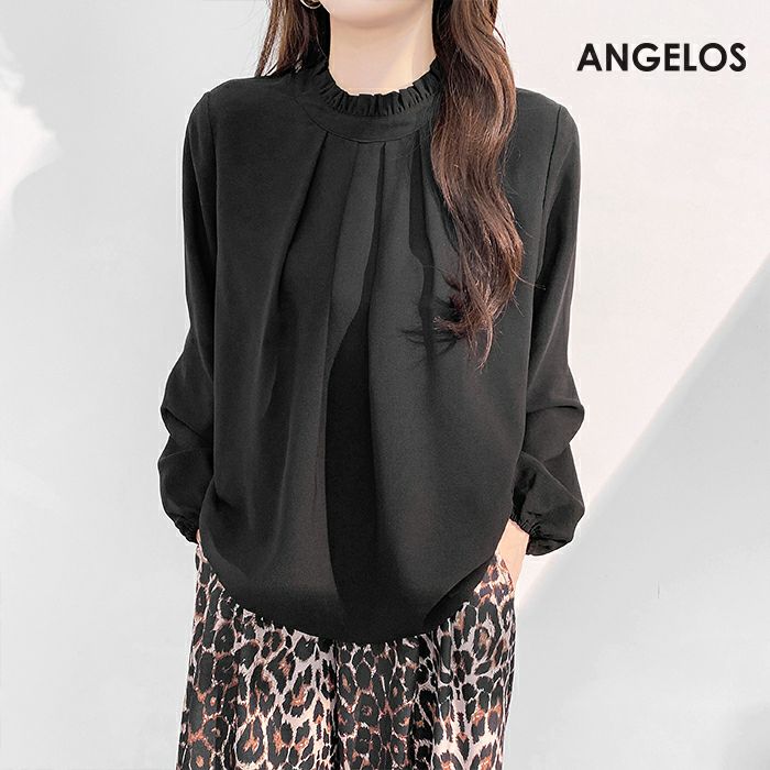 リボンタイ付きスタンドカラーリブ袖ブラウス