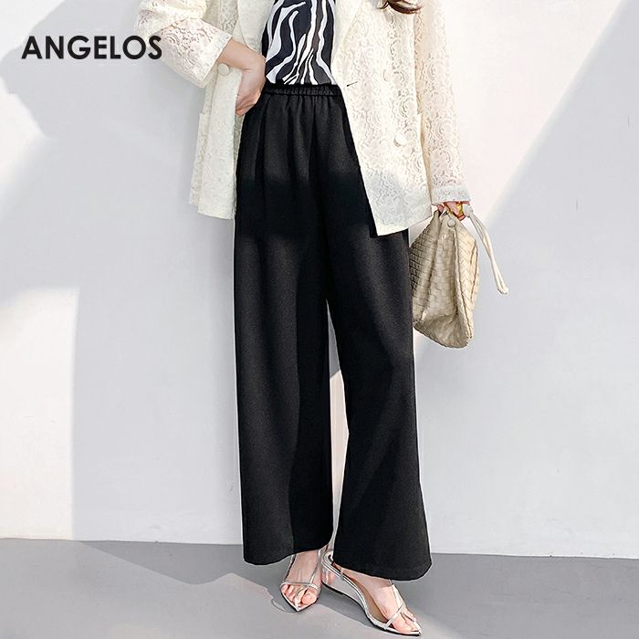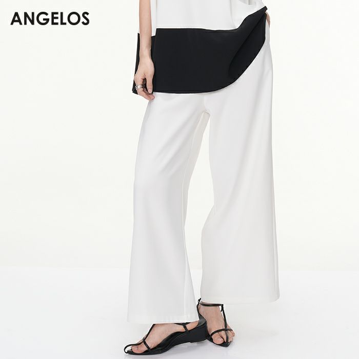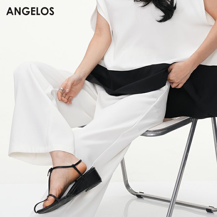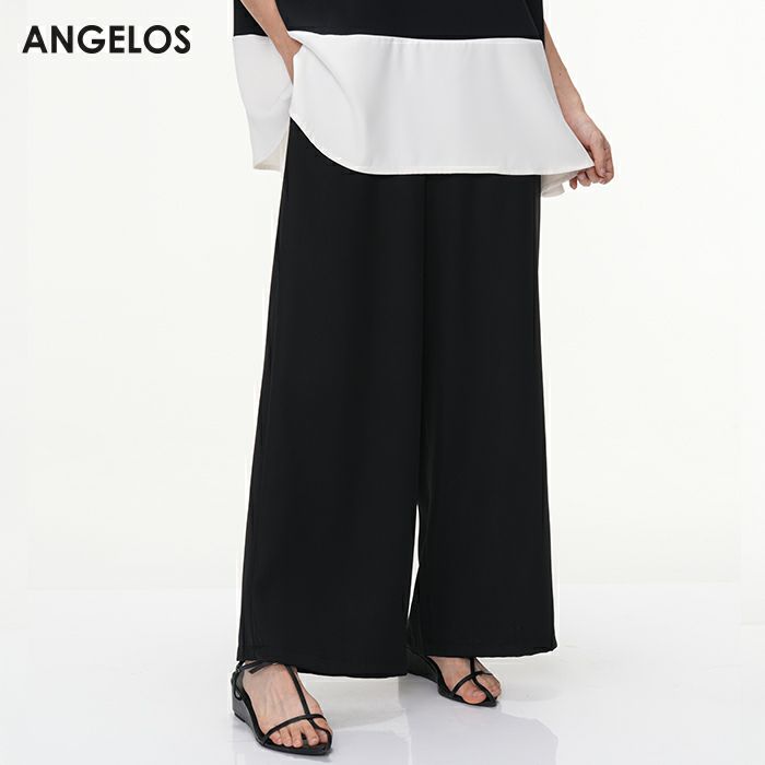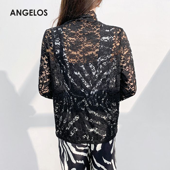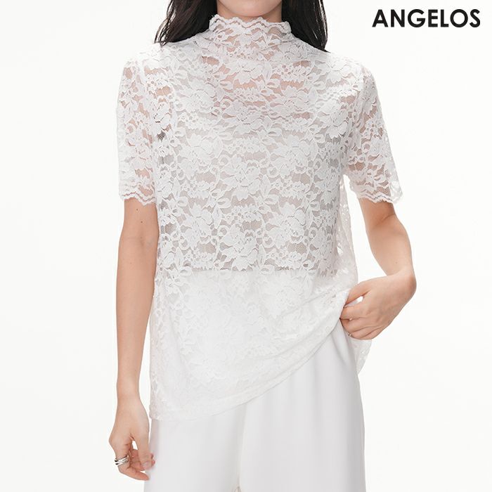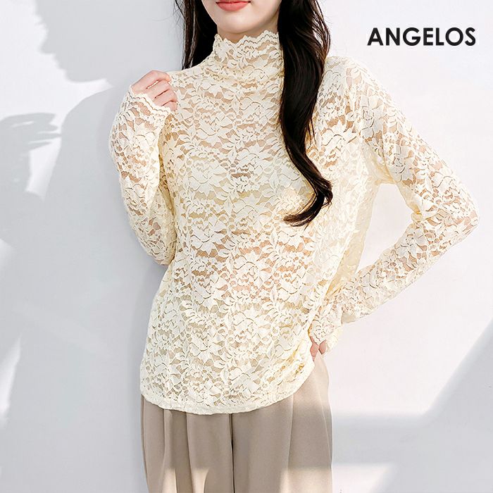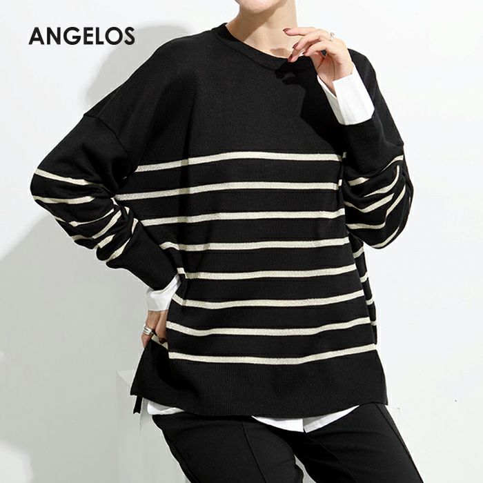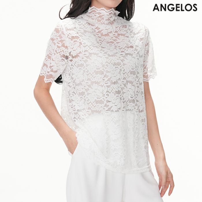 リボンタイ付きスタンドカラーリブ袖ブラウス